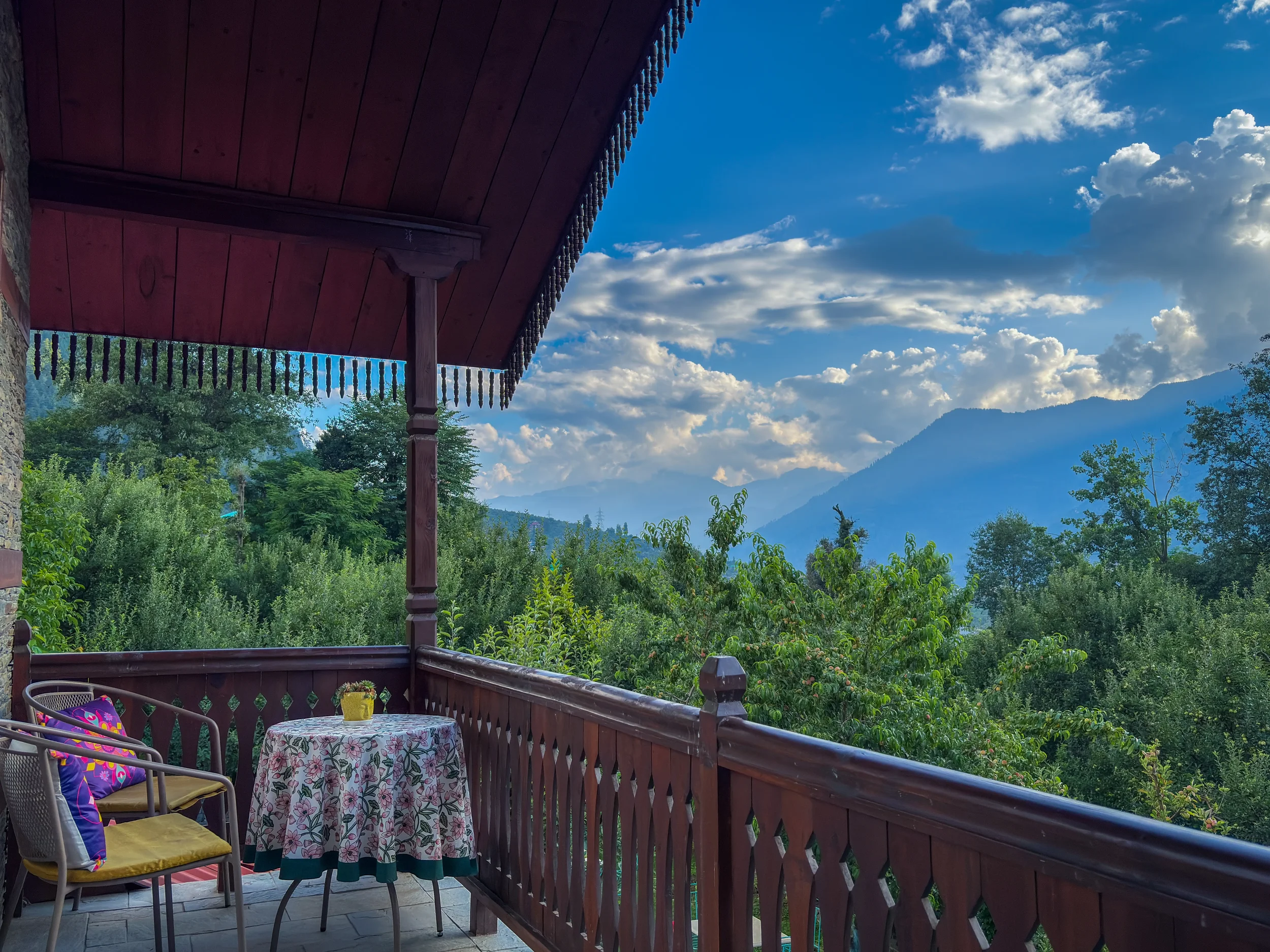 You're living inside a working apple orchard. The seasons change around you — blossoms in spring, heavy branches in autumn, bare trees in winter. Candlelit dinners under the Milky Way, bonfires in the garden, cooking classes for siddu and momos, village walks that take you into daily Himachali life, sunsets that stop you mid-sentence. The gupshup room when you want to do nothing at all. This is the unhurried part of the stay most people don't want to leave.