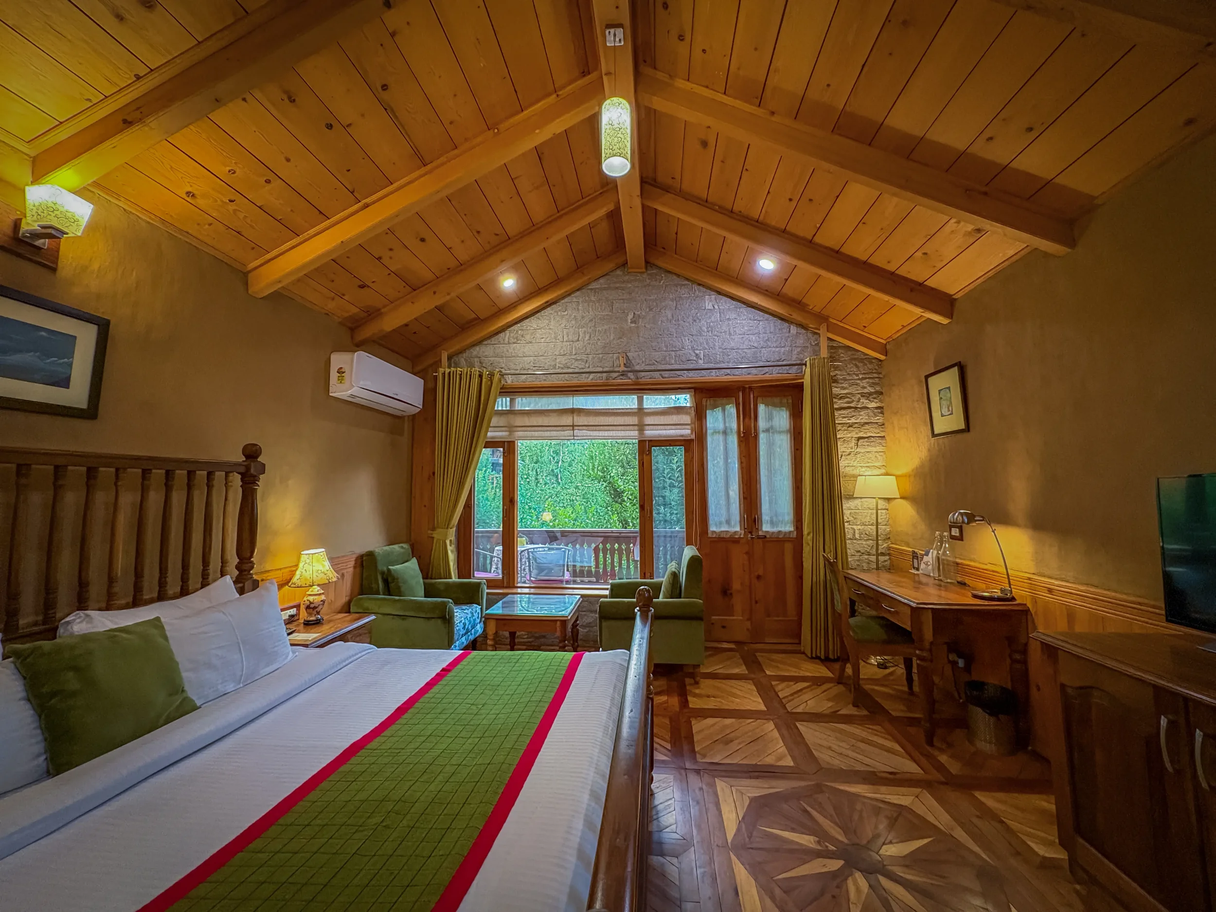 Higher up, quieter, with the Dhauladhar sitting right outside your window. One side looks out to the apple orchard. Inside, Indian rosewood furniture and a full stone wall — the same craft and material as the Royal rooms, in a space that feels more tucked in than opened up. For those who want the view without the scale.