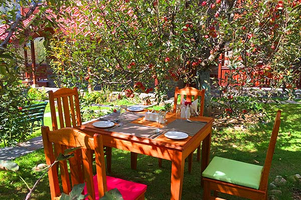 Three pillars providing strength to the lentel & roof have been painstakingly handmade using stone work. The tastefully done wood work drives its inspiration from the local art work. ShivAdya has 7 high ceiling rooms give you a royalty feel of erstwhile Raj era. Entire furniture has been handcrafted and made on site. Cottage block I has furniture made of local Fir wood with simple designs. Ground floor of Cottage block II has furniture made of Sheesham and its first floor has Walnut furniture. Even the entire flooring in rooms is of hard wood. Flooring of 9 rooms in block 2 has been done using different style drawing inspiration from floor art work from Belgium in usage in 1800’s.